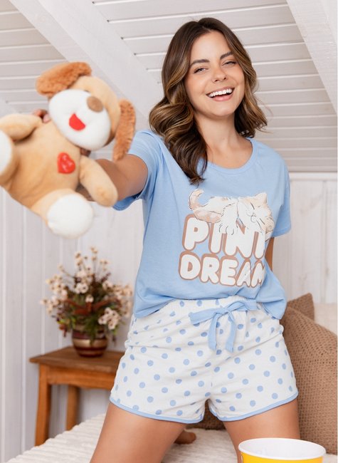 Para o Pijama Feminino Algodão POA Azul Gato, a Pink Dream desenvolveu uma estampa exclusiva, um all print POA alternado entre cores azuis e pérola junto com uma estampa de gatinho super fofo na blusa. Tudo isso dentro das mais atualizadas tendencias da moda. Cada cor é selecionada com carinho e cuidado, para que o conjunto fique delicado, fofo e simplesmente incrível para você!